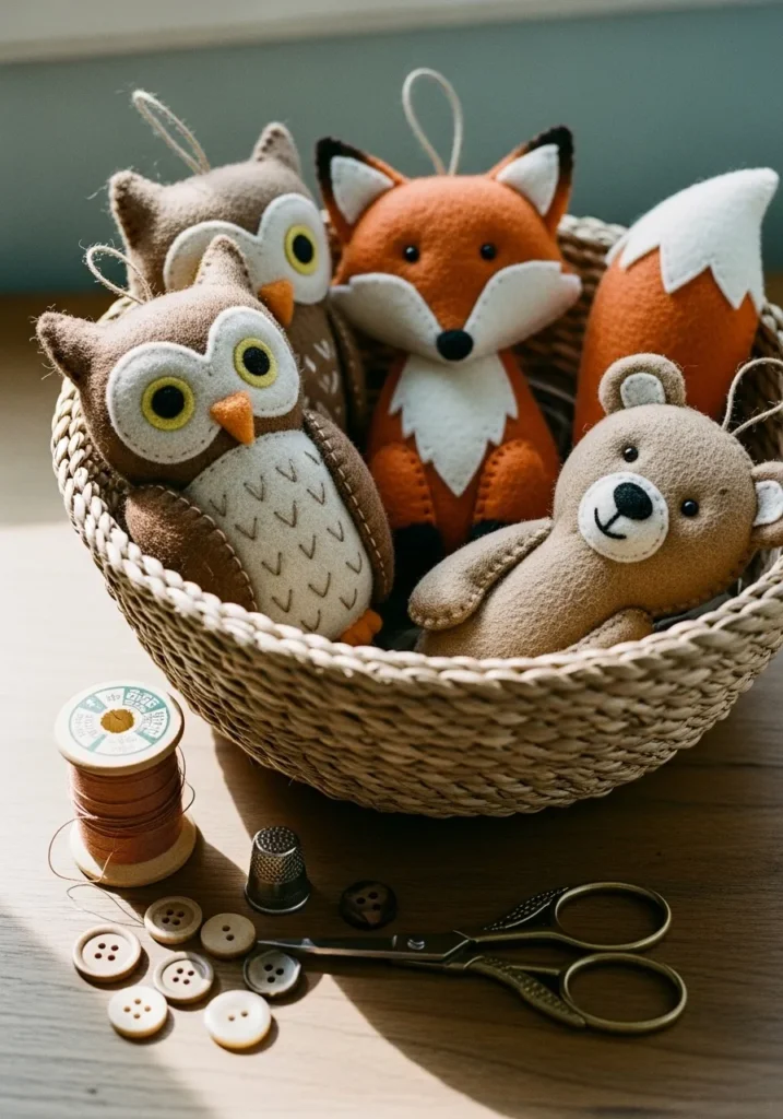 This basket of felt animals is pure woodland wonder. The fox, owls, and bear are stitched with soft brown, tan, and orange hues that feel perfectly cozy for the season. Their little faces are full of charm, and the basket beside the sewing tools adds a lovely handmade touch that feels so real and personal.