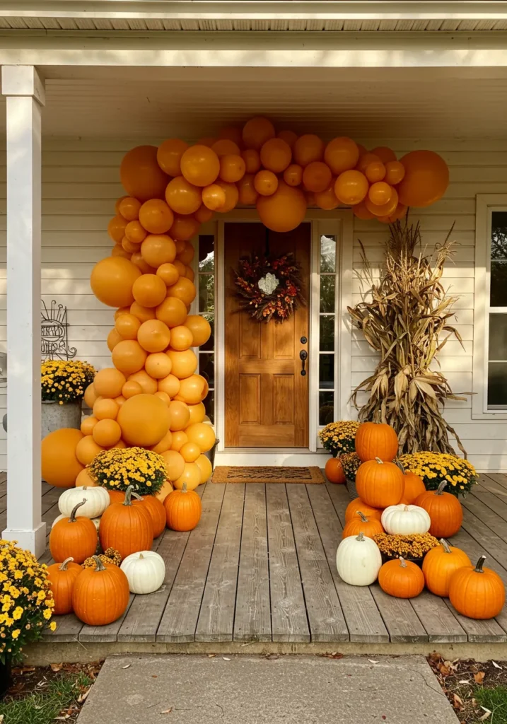 The front porch is dressed for Thanksgiving with a bold balloon arch in warm shades of orange wrapping around the doorway. Pumpkins in all shapes and sizes sit on the steps along with cheerful mums and tall cornstalks.