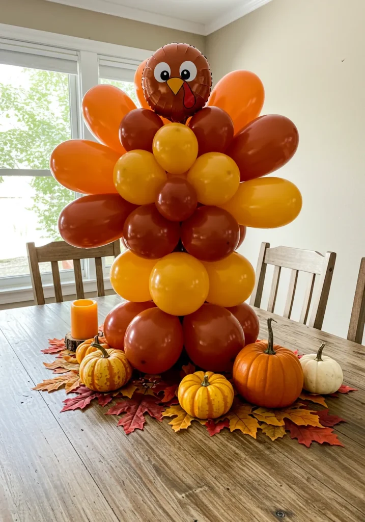 A playful turkey-shaped balloon display sits right in the middle of the dining table, with brown, orange, and yellow balloons forming its feathers. Mini pumpkins and autumn leaves surround the base for extra charm.