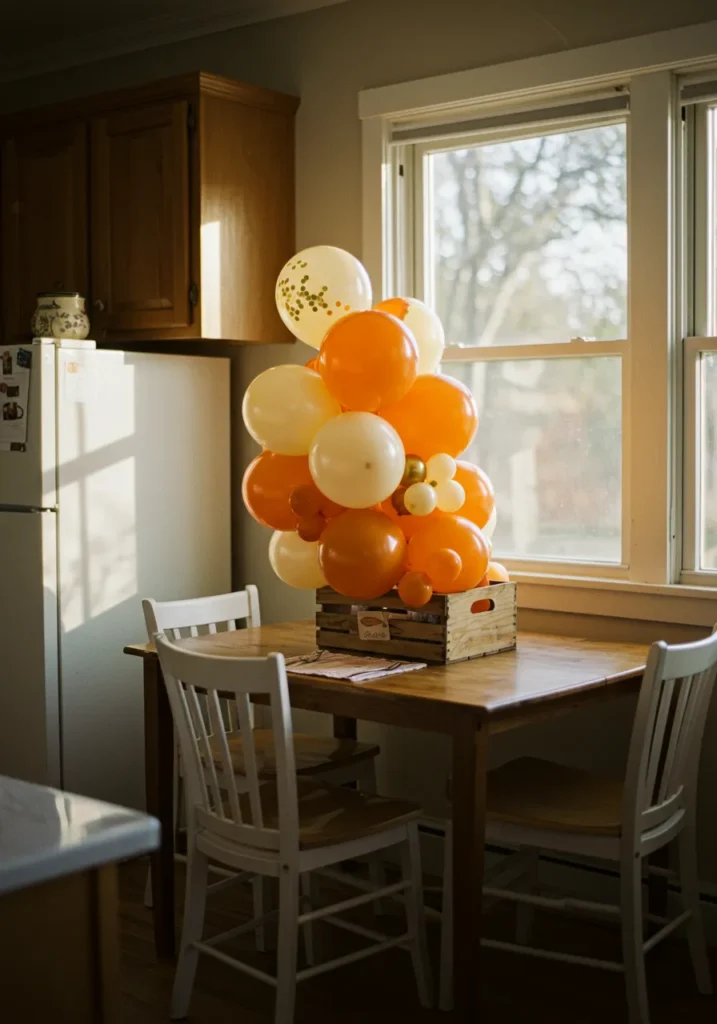 A rustic wooden crate holds a bundle of balloons in orange, cream, and gold, set on a small kitchen table by the window. The sunlight makes the balloons glow softly against the simple backdrop.
