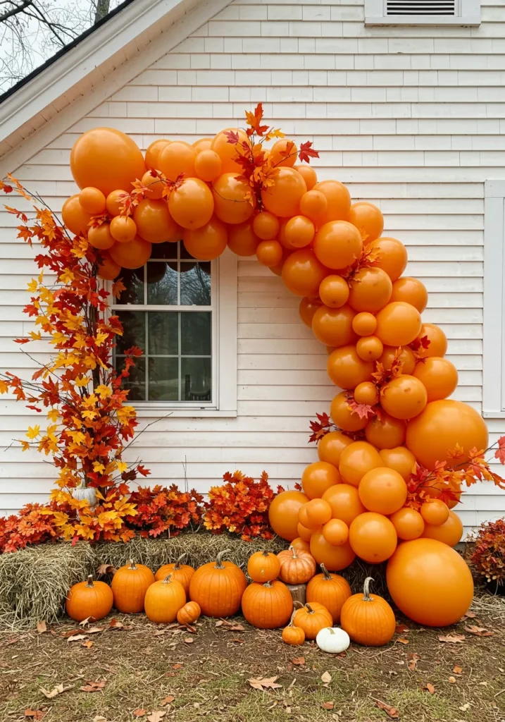 The white siding of the house pops against a giant orange balloon arch accented with red and yellow fall leaves. Pumpkins and hay bales are lined up underneath, creating a festive outdoor display.