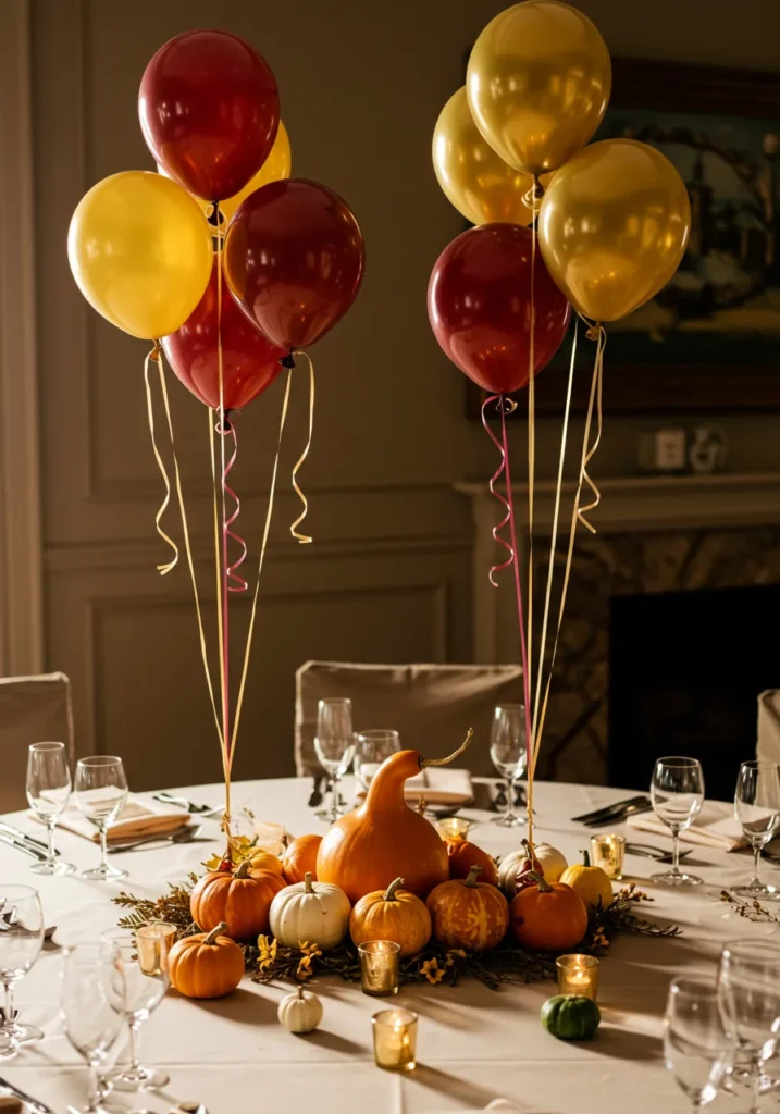 A round dining table is styled with clusters of balloons in burgundy and gold rising above a pumpkin centerpiece. The glow of candles and soft lighting makes the whole setting feel warm and celebratory.