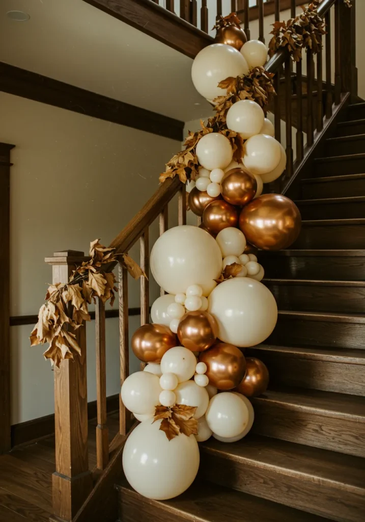 This staircase feels like a grand entrance all on its own with creamy white and metallic bronze balloons flowing down the railing. Dried golden leaves are tucked into the arrangement, giving it a seasonal touch that feels elegant and cozy at the same time.