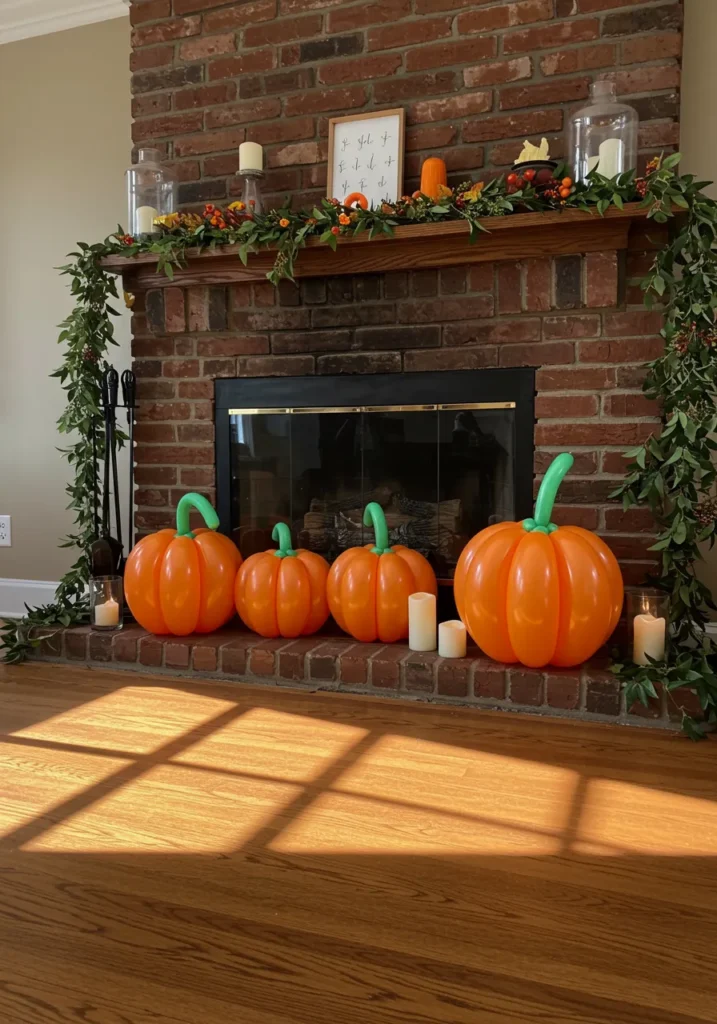 The brick fireplace is styled with balloon pumpkins in different sizes lined up along the hearth. Green balloon stems give them a realistic touch, while candles and garlands add to the cozy fall atmosphere.