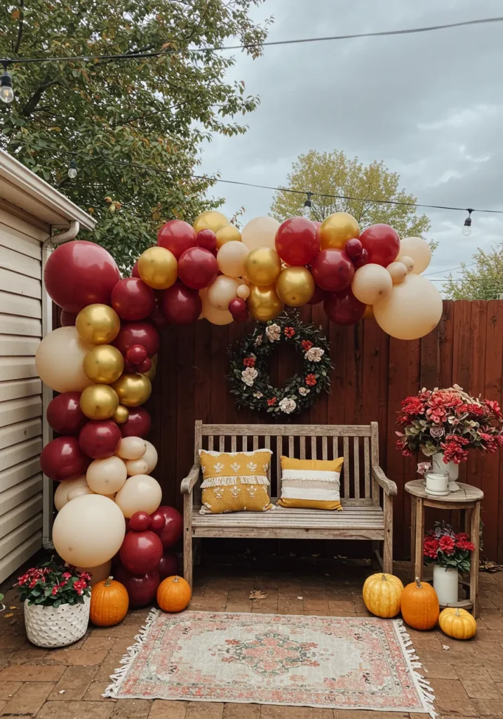 A rustic outdoor corner is decorated with a balloon arch in burgundy, cream, and gold framing a wooden bench. Pumpkins and potted flowers sit below, while cozy throw pillows make the space extra inviting.