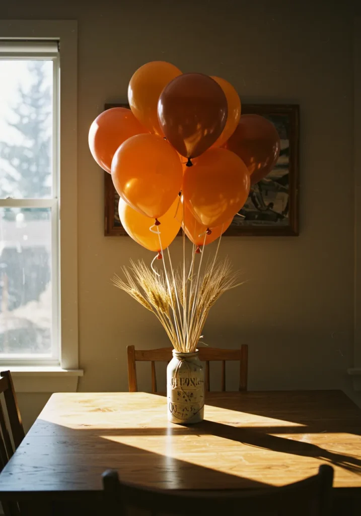 A mason jar vase filled with wheat stalks holds a cluster of orange and brown balloons that float above the table. The soft light from the window makes the colors glow, creating a simple yet festive display.