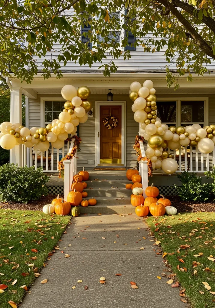 The front porch is dressed with balloon garlands in cream and metallic gold draped along the railings. Pumpkins line the steps, and a seasonal wreath hangs on the door for a polished holiday welcome.