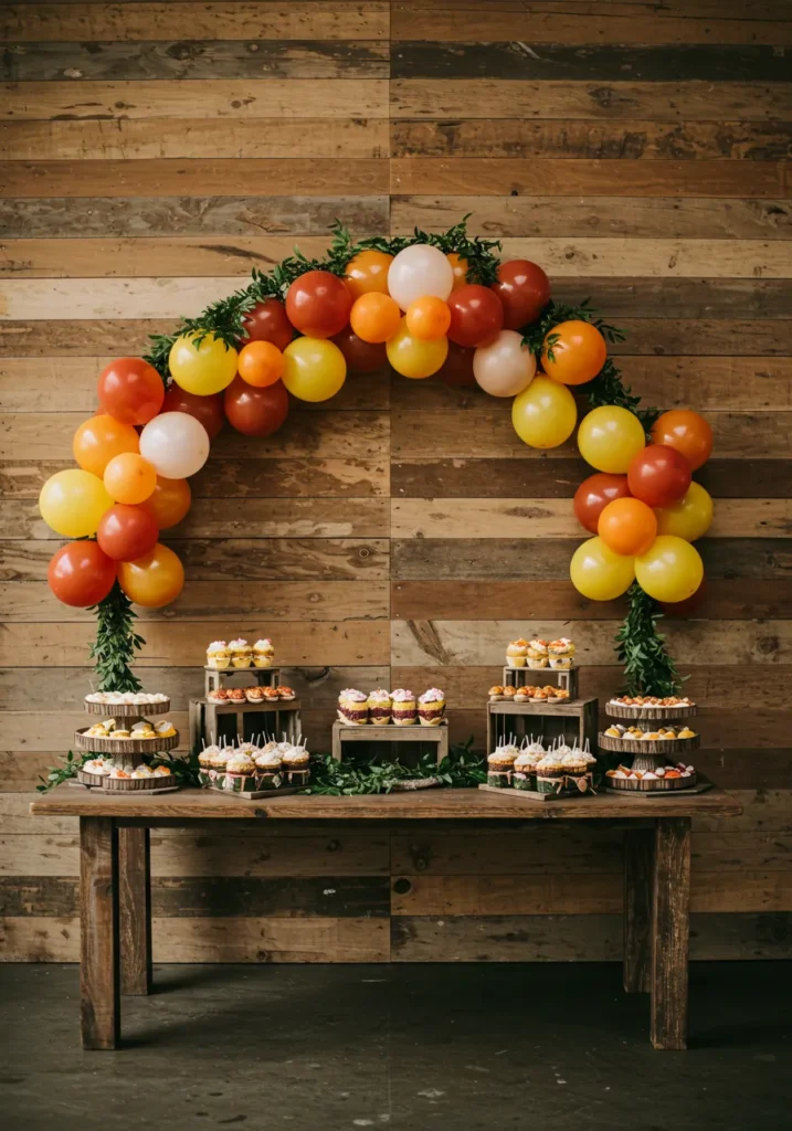 A rustic wooden dessert table is framed with a colorful balloon arch in orange, yellow, cream, and red. Cupcakes, sweets, and greenery complete the look, making the table the star of the celebration.