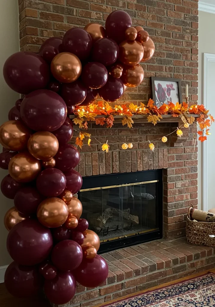 The brick fireplace is framed with rich burgundy and copper balloons that climb along one side. The mantle is decorated with glowing lights and autumn leaves, making the room feel warm and cozy.