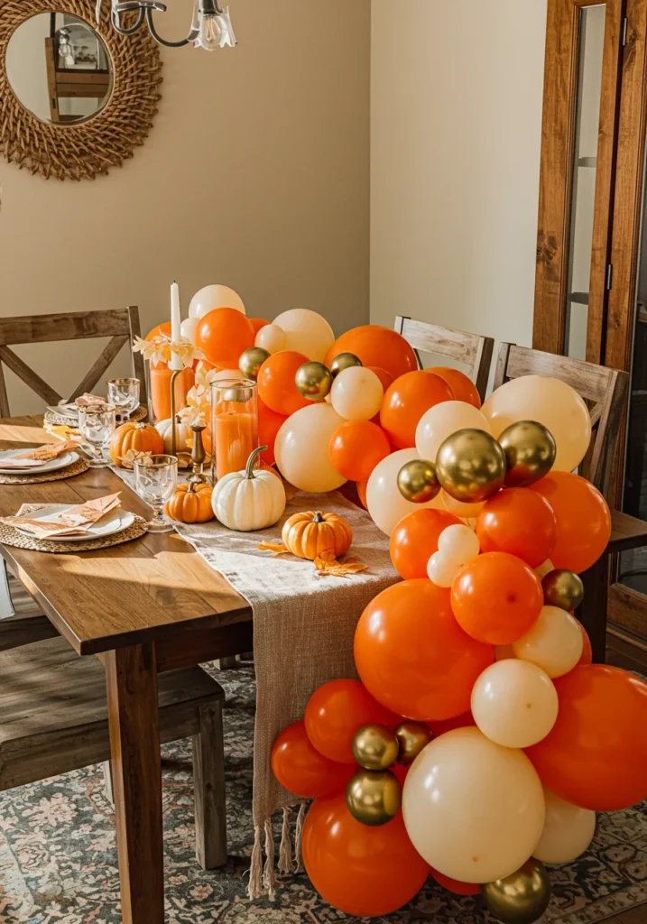 This dining table is dressed with a vibrant balloon garland in shades of orange, cream, and gold that runs across the center and spills gracefully over the edge. Mini pumpkins, candles, and autumn leaves are tucked along the runner for a cozy and seasonal look.