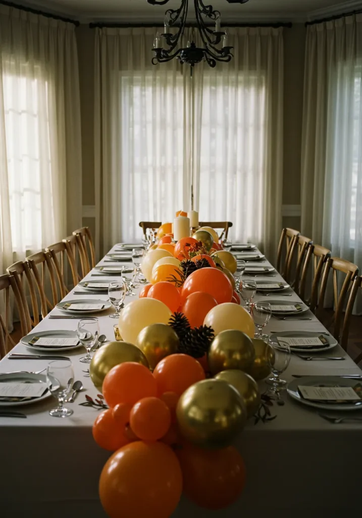 A long table is styled with a balloon runner down the center in gold, orange, and cream. Pinecones and candles are tucked between the balloons, creating a centerpiece that feels festive yet natural.