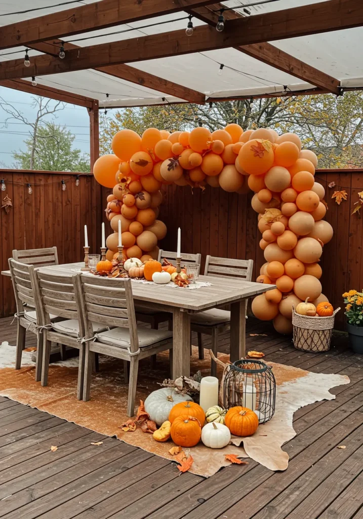 The wooden patio is styled with a large balloon arch in orange tones draped above the table. Pumpkins, candles, and seasonal leaves are scattered across the table, giving it a warm rustic charm.