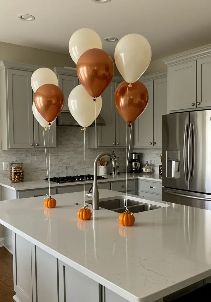 The kitchen island is decorated with metallic bronze and cream balloons tied to tiny pumpkins. The simple gray cabinets and marble counters make the balloon colors pop even more.