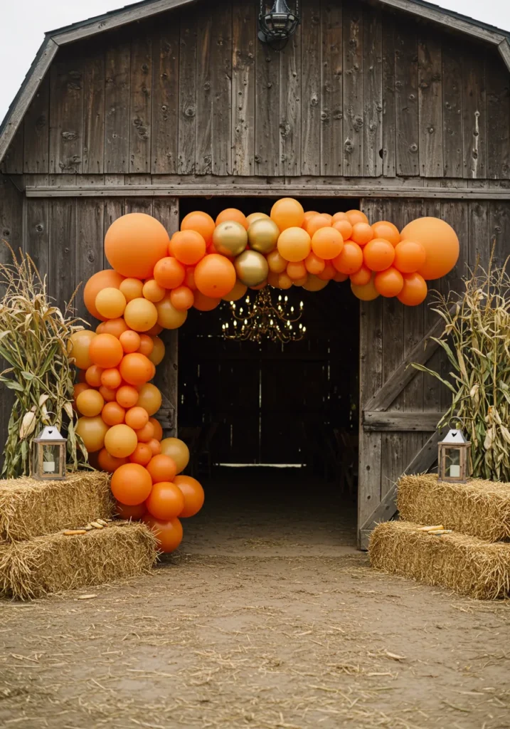 A rustic barn is decorated with a large arch of orange and gold balloons framing the wide doors. Cornstalks, hay bales, and lanterns finish off the look for a festive country vibe.
