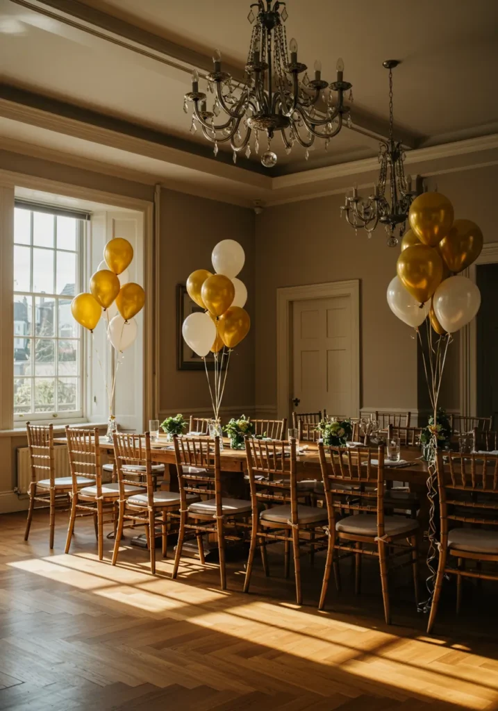 This dining room looks so graceful with golden and white balloon clusters standing tall by the table. The chandeliers add a touch of sparkle while the natural sunlight pours through the large windows, making the whole setting feel welcoming and festive.