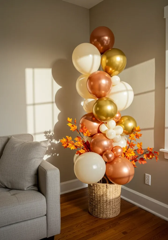 A woven basket is filled with balloons in cream, copper, and gold, with bursts of orange fall leaves peeking out. The arrangement stands tall in the corner of the room, catching the sunlight that streams through the window.
