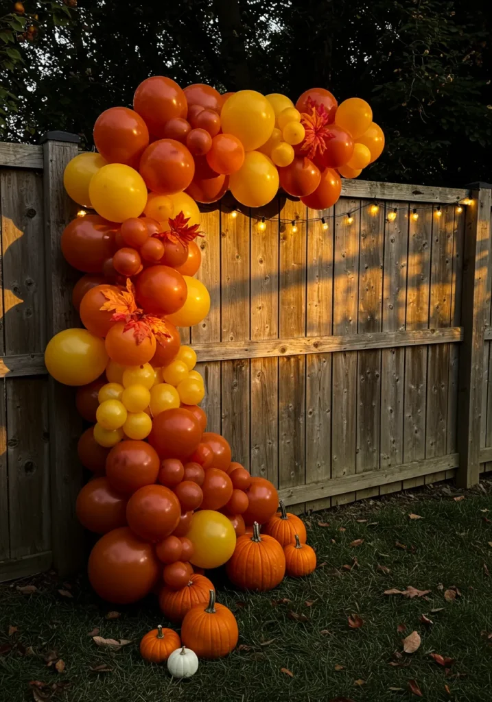 The wooden backyard fence becomes the perfect backdrop for a fiery balloon arch in shades of red, orange, and yellow. Pumpkins rest along the grass beneath the balloons, while string lights glow warmly above.