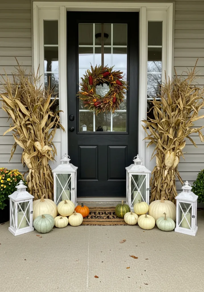A neutral palette makes this entryway feel crisp and sophisticated. White and pale green pumpkins pair beautifully with tall cornstalks and white lanterns. The black front door grounds the space, while the fall wreath adds just enough color to make it pop.