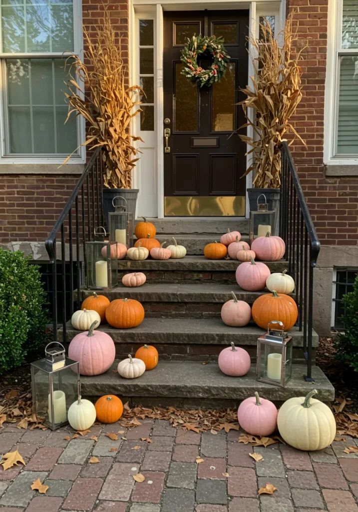Soft pastel pumpkins steal the show on this brick porch. The mix of pale pinks, whites, and oranges feels playful yet elegant, while the lanterns add that classic Thanksgiving glow. Cornstalks and a fall wreath bring in a natural touch that ties everything together.