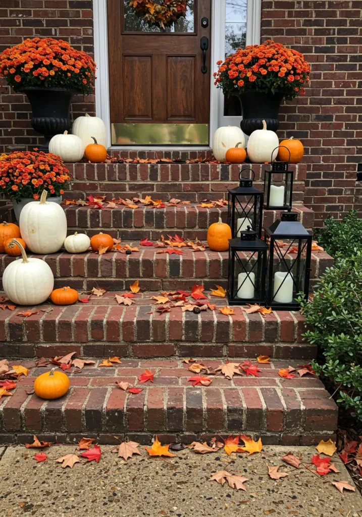 This brick front porch feels beautifully traditional. Cream and orange pumpkins line the steps, framed by deep orange mums and black lanterns. A scattering of red and yellow leaves completes the look, adding that natural fall touch that feels effortless.