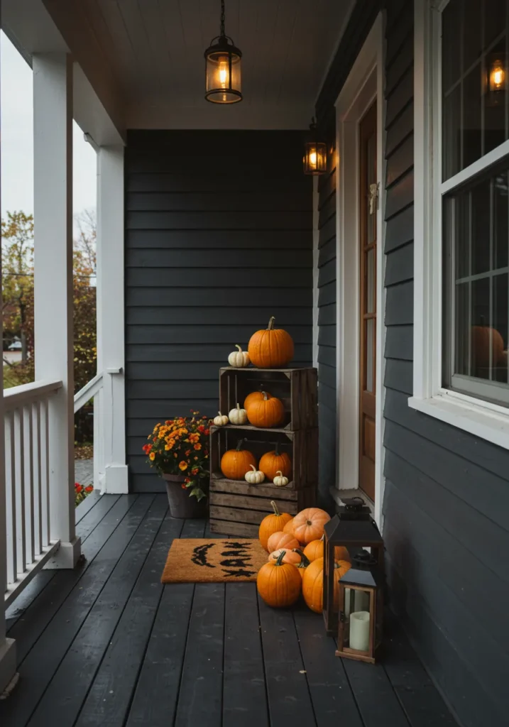 Nothing says cozy like a front porch with rocking chairs and a tower of pumpkins. Here, different shades of orange, white, and pale green pumpkins are stacked beside soft candle lanterns. The crisp white siding and black shutters make the colors pop, while the open space keeps the porch feeling airy and peaceful.