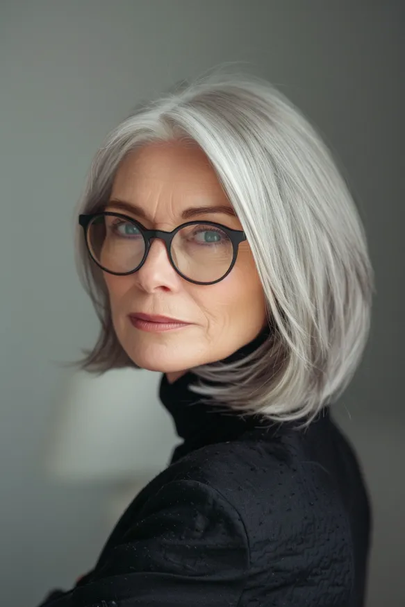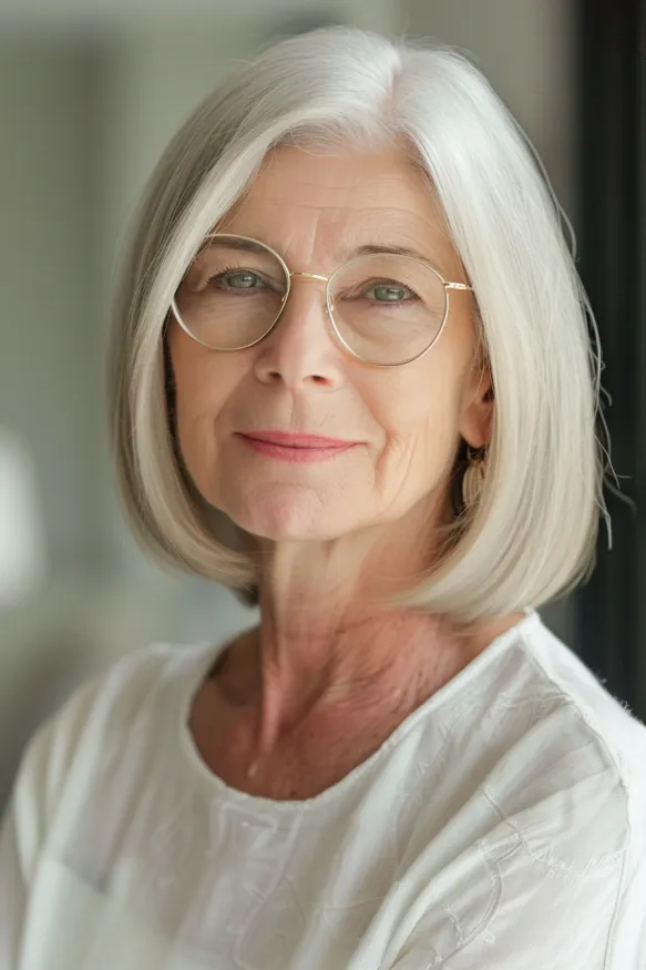 This timeless bob is all about clean lines and effortless sophistication. The blunt cut falls just below the chin, creating a polished and structured look. A center part keeps it modern, while the smooth finish enhances the sleekness of the style. The icy silver hue adds a fresh, luminous touch that pairs beautifully with glasses, making this hairstyle a refined yet approachable choice.