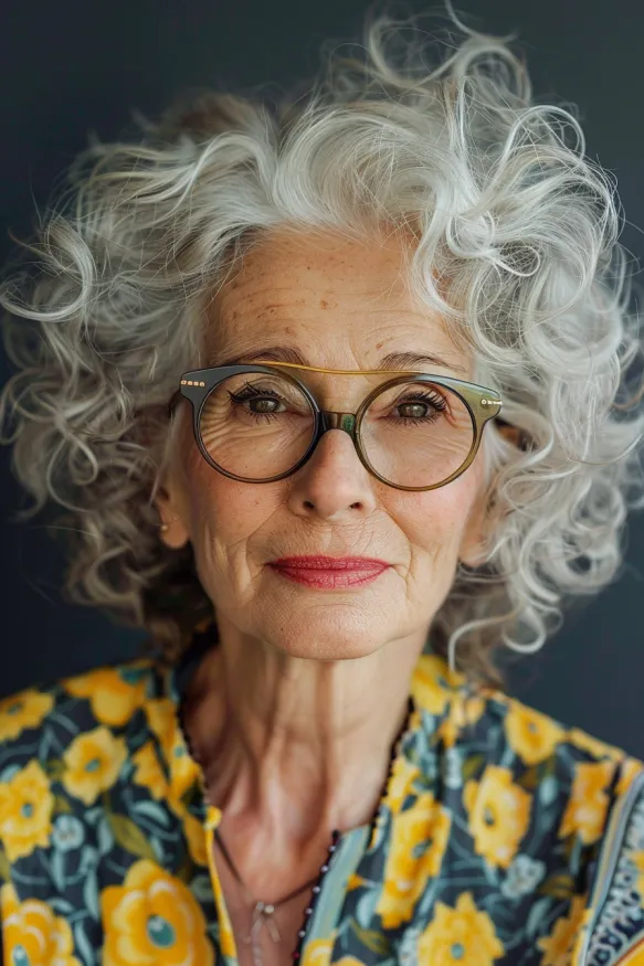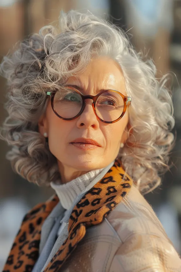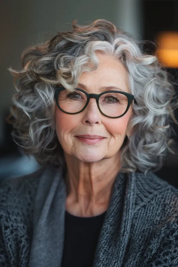 This stunning curly bob is all about bounce, volume, and effortless glamour. The shoulder-length cut keeps the curls full and defined, creating a naturally lifted shape. A soft side part adds just the right amount of drama, making the curls frame the face beautifully. The silver hue gives the style extra depth, catching the light in the most flattering way. Paired with glasses, it’s both bold and elegant.