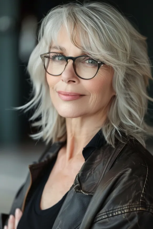 This effortless shag cut brings out the best of soft, feathered layers and natural volume. The medium length allows for movement, while the wispy bangs gently frame the face for a youthful touch. The slightly tousled texture adds a casual, carefree feel, making this hairstyle look effortlessly stylish. The silver-blonde tones enhance the dimension, creating a luminous effect that pairs perfectly with glasses.