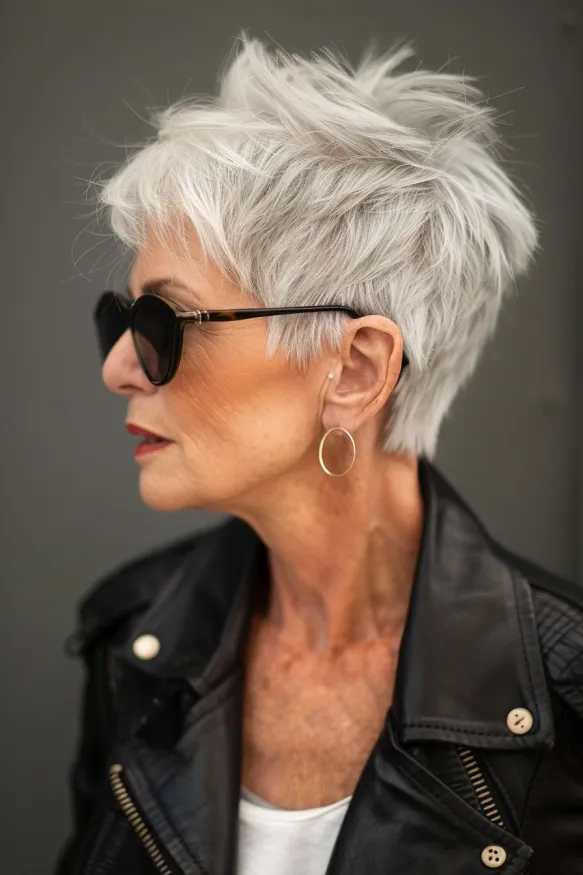 A pixie like this isn’t just a haircut—it’s a whole attitude. It’s bold, fearless, and packed with personality. The spiky texture adds just the right amount of fun, giving it a rebellious yet chic energy. It’s the perfect style for anyone who loves to stand out and embrace their natural silver with a modern, stylish edge. Plus, it looks incredible with a leather jacket—because why not turn heads wherever you go?