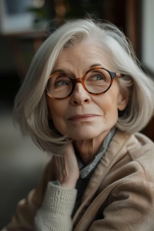 This timeless bob is the definition of effortless sophistication. The length sits just above the shoulders, making it both flattering and easy to manage. Soft layers add movement, while the subtle side part frames the face beautifully. The silver strands shine with natural dimension, giving the look a graceful elegance. Paired with glasses, this cut feels polished and refined without looking too rigid.