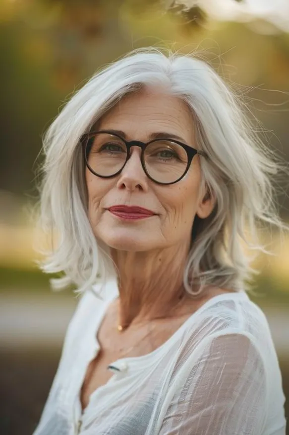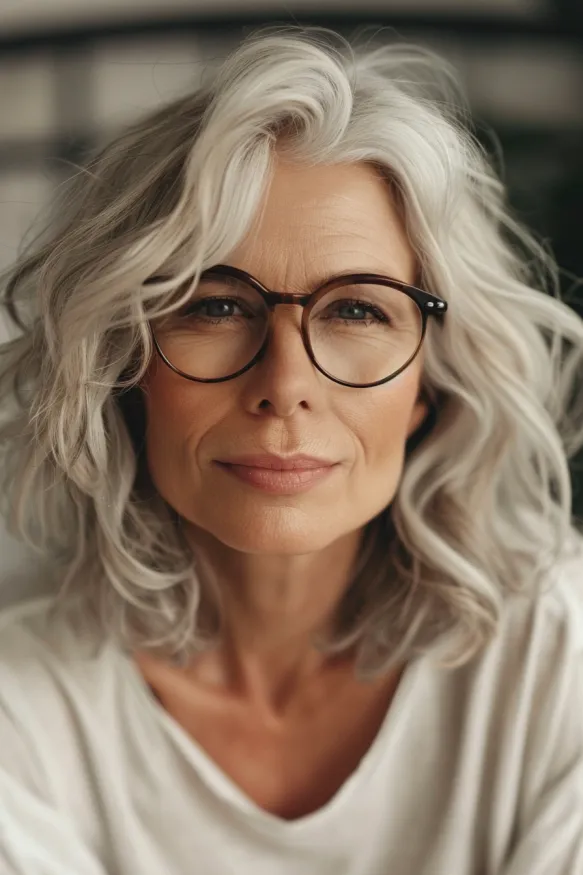 This relaxed shoulder-length cut is effortlessly stylish with its soft, airy layers. The gentle waves add natural movement, keeping the look fresh and full of life. A slightly off-center part frames the face beautifully, allowing the silver strands to catch the light in the most flattering way. The easygoing texture makes this hairstyle versatile, pairing seamlessly with glasses for a timeless, laid-back elegance.