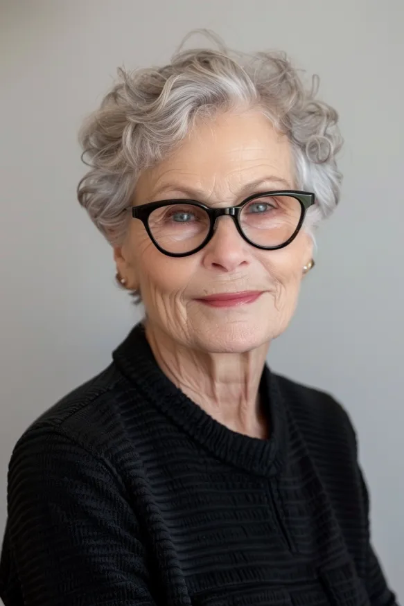 This charming short crop embraces natural curls, creating a soft and voluminous look. The closely tapered sides keep the style neat, while the top curls add movement and texture. The gentle wave pattern frames the face beautifully, giving a youthful and elegant feel. The silver tones enhance the dimension, making this cut both flattering and effortlessly stylish—especially when paired with glasses.