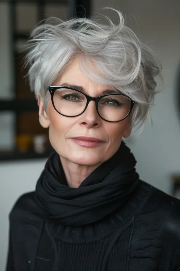 This bold, textured pixie cut is the definition of confidence and style. The choppy layers create a modern, tousled effect, adding volume and movement to the look. The tapered sides keep it sleek, while the slightly longer top allows for a playful, spiky finish. The icy silver shade enhances the edgy vibe, making this cut both fierce and sophisticated. Paired with glasses, it’s the ultimate statement hairstyle.