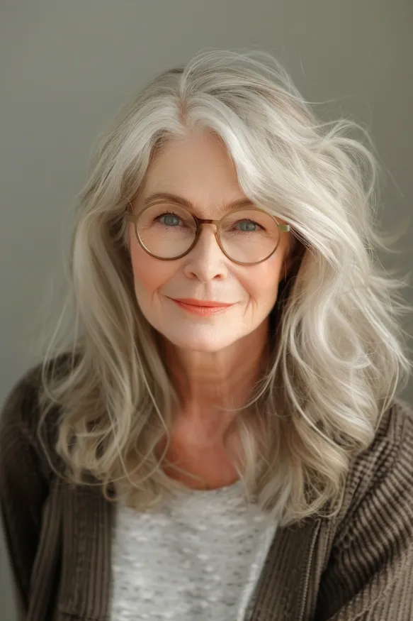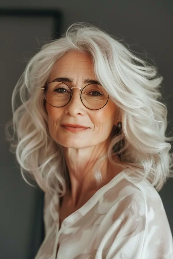 This hairstyle brings effortless movement with its soft, cascading waves. The layers add just the right amount of texture, making the hair feel full and bouncy without being overwhelming. A slightly off-center part creates a flattering, face-framing effect that pairs beautifully with glasses. The natural silver tone enhances the depth and dimension, giving the whole look a fresh and youthful glow.