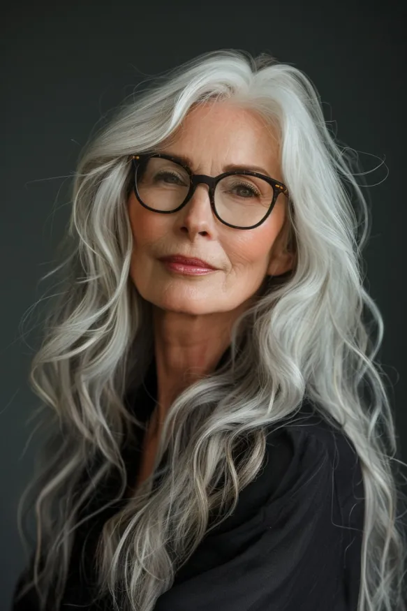 This breathtaking hairstyle embraces length, volume, and natural movement. The cascading waves flow effortlessly, creating a soft and romantic look that enhances the face beautifully. Subtle layers add dimension, preventing the hair from feeling heavy while maintaining a graceful shape. The silver strands shine with a luminous glow, making this style feel both elegant and effortlessly chic. Paired with glasses, it exudes confidence and timeless beauty.