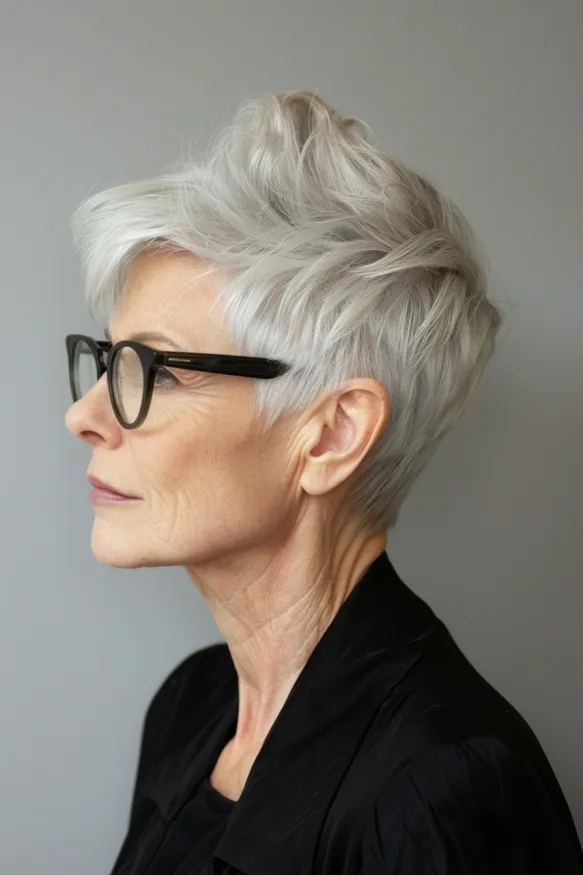 This edgy yet sophisticated pixie cut is all about clean lines and soft texture. The tapered sides keep the look sleek, while the longer layers on top add volume and movement. A subtle lift at the crown creates a flattering shape, making this cut both stylish and practical. The silver hue enhances the modern feel, giving the entire look a fresh and confident vibe. Paired with glasses, it’s a perfect mix of bold and refined.