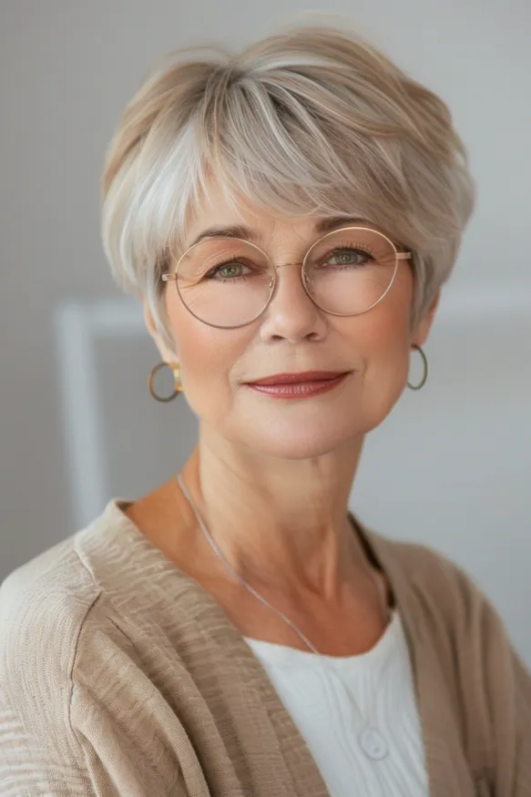 This beautifully layered pixie is the perfect blend of structure and softness. The layers add volume and movement, while the wispy bangs create a gentle frame around the face. The slightly longer length at the top allows for versatile styling, whether swept to the side or lightly tousled. The silver hue, with subtle hints of warm tones, gives it a fresh, youthful glow that pairs seamlessly with glasses.