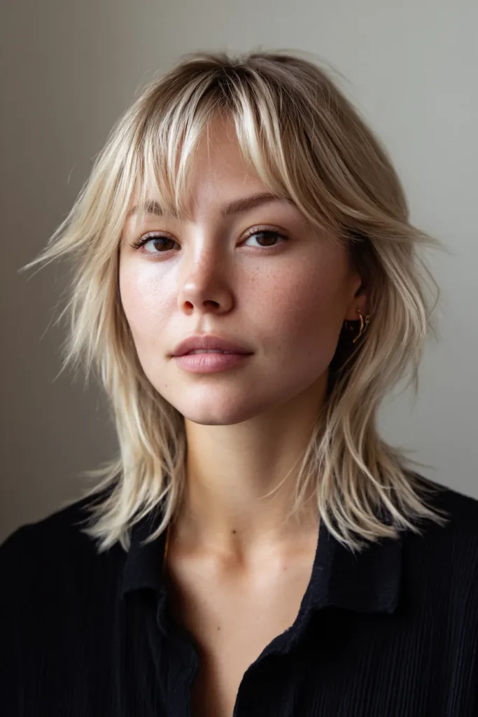 This medium-length cut is for the bold souls who love a mix of retro punk and modern chic. It features a bright bleached blonde shade with subtle darker roots that add a bit of depth and edge. The style is a hybrid between a mullet and a shag with shorter choppy layers on top and a longer, thinned-out back that rests on the shoulders. It has piecey eyebrow-skimming bangs that blend into feathered side sections, which create a lot of horizontal movement and airiness.