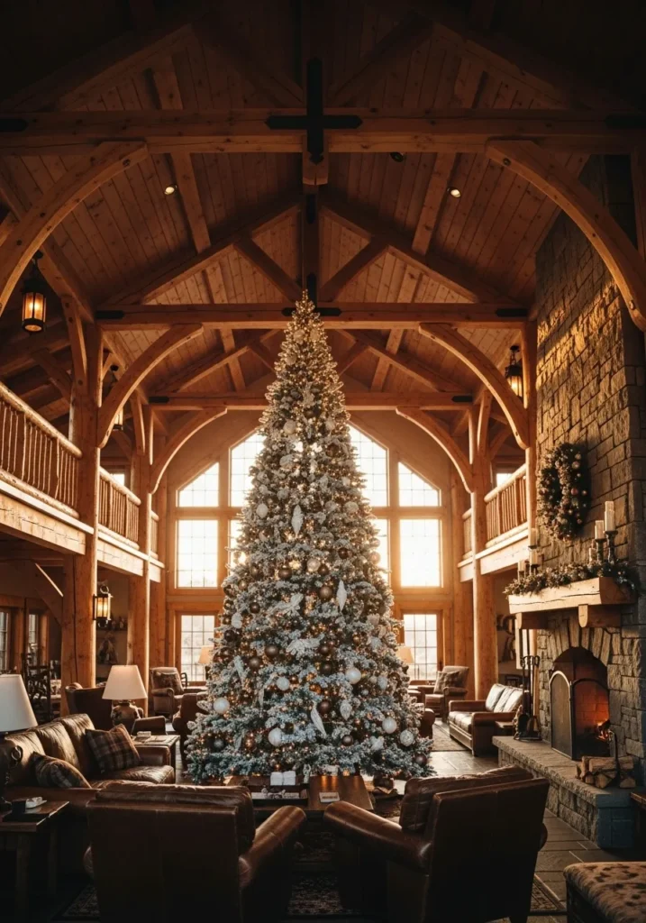 This living room feels like the coziest winter retreat you could dream of. The soaring timber beams, the stone fireplace, and that towering flocked Christmas tree instantly set the mood for a snow-kissed escape. Warm sunlight filters through the tall windows, catching every shimmer of the frosted ornaments and golden baubles. Plush leather sofas and soft plaid accents make it feel both grand and inviting, like the perfect spot to sip cocoa and watch the fire crackle while the snow falls outside.
