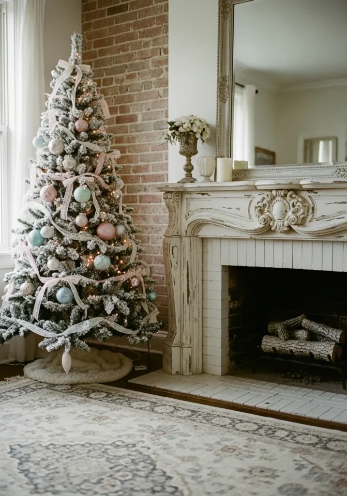 This living room feels like it was kissed by the first snowfall of December. The flocked Christmas tree stands elegantly beside a whitewashed fireplace with ornate carvings, its branches dusted in snowy magic. I love how the soft pink and powder blue ornaments bring a pastel sweetness to the scene, while the gentle twinkle lights make everything feel cozy and romantic. The brick wall adds the perfect rustic contrast, grounding the airy tones with just the right touch of warmth.