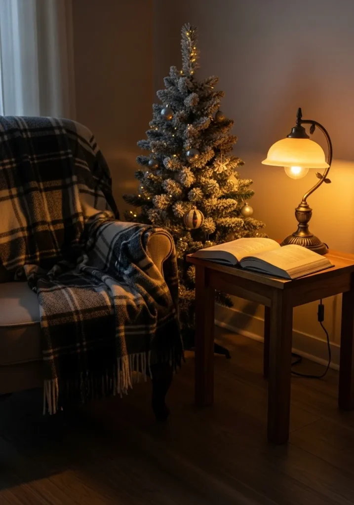This little corner feels like the perfect winter hideaway. A small flocked Christmas tree twinkles softly beside a warm reading lamp, casting a golden glow that dances across the room. The plaid throw draped over the armchair adds that irresistible cabin feel, while the open book on the wooden side table makes it clear this is a space meant for quiet moments and slow evenings. The mix of soft lighting, textured fabrics, and delicate frosted branches creates a cozy yet refined look that’s both festive and peaceful.