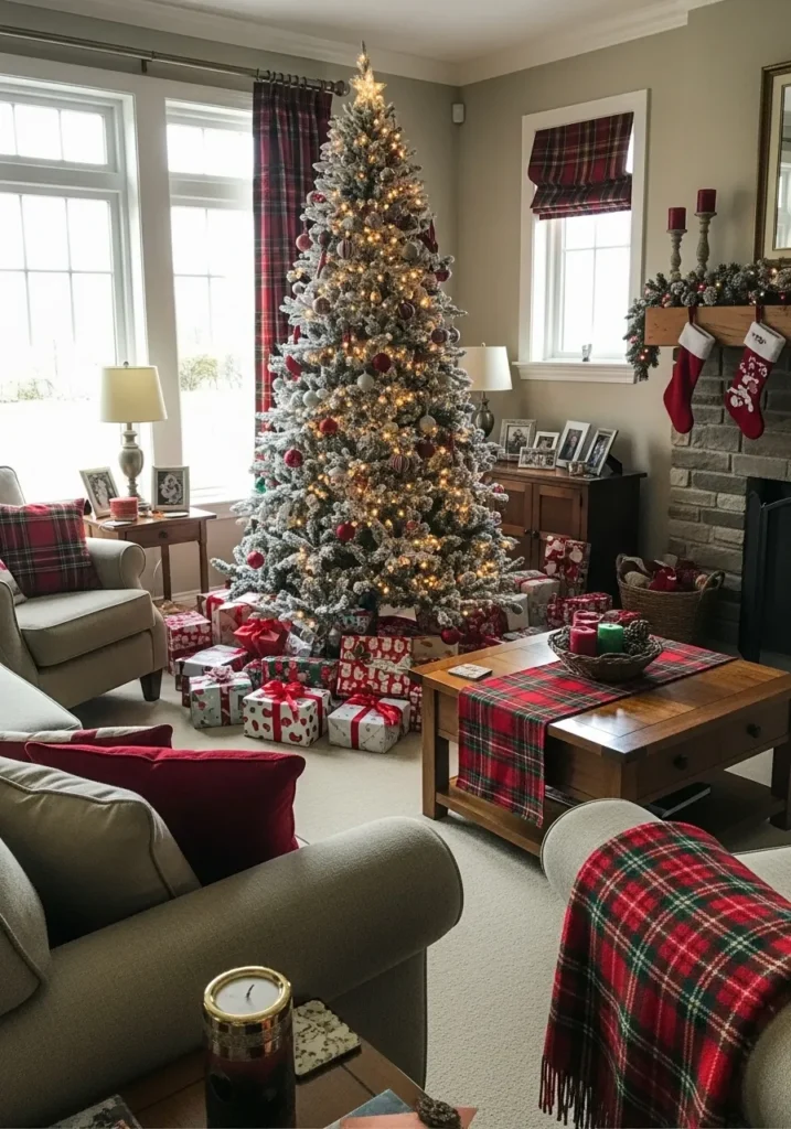 This cozy living room captures everything I adore about a traditional Christmas done right. The flocked tree stands tall and elegant, wrapped in warm white lights and dotted with red and silver ornaments that feel timeless. Plaid accents tie the entire look together—from the curtains to the throw blankets and table runner—giving the space that “curled-up-by-the-fire” kind of comfort. The stone fireplace, wrapped in garland and topped with stockings, makes the whole room feel like it’s straight out of a Christmas movie.