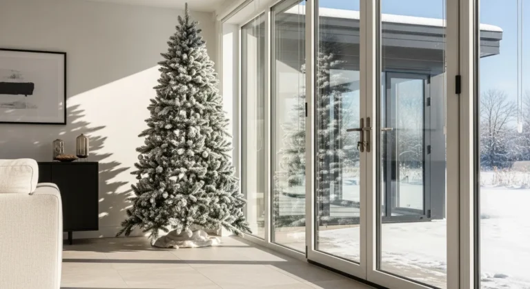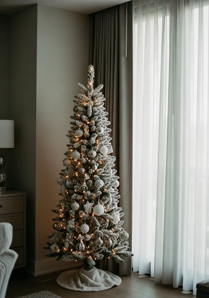 This space feels like the perfect example of how less can truly be more. The slim, flocked Christmas tree stands gracefully beside tall sheer curtains that let in soft natural light. Its snowy branches are sprinkled with delicate white and silver ornaments that shimmer gently under the warm fairy lights. The neutral walls, muted drapes, and light wood flooring all come together to make the tree feel like part of the architecture rather than just a seasonal guest. It’s calm, clean, and effortlessly elegant.
