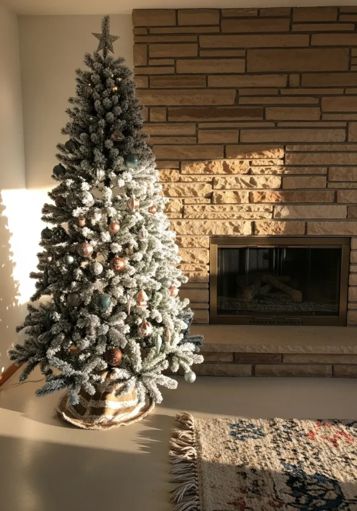 This cozy living room captures that simple, heartwarming magic we all crave during the holidays. The flocked Christmas tree stands proudly beside a stone fireplace, its snow-kissed branches dusted with soft white frost that glimmers beautifully in the golden afternoon light. Subtle ornaments in copper, teal, and silver tones add just the right amount of sparkle without overpowering the natural, rustic backdrop. The woven tree collar and fringed rug tie everything together, giving the space a grounded, handcrafted feel that whispers quiet elegance.