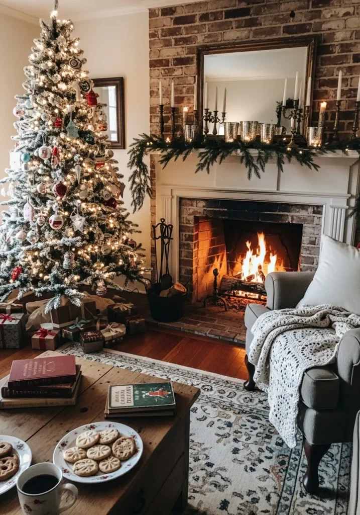 This charming living room feels like it was made for Christmas morning. The flocked tree glimmers softly with white lights and nostalgic ornaments, perfectly complementing the rustic brick fireplace that steals the scene with its golden glow. Garland drapes across the mantel, sprinkled with candles that flicker gently beneath a framed mirror, reflecting the warmth around the room. Cozy armchairs, a knitted throw, and a tray of cookies complete this heartwarming setup, making it the kind of space where you could happily stay all winter long.