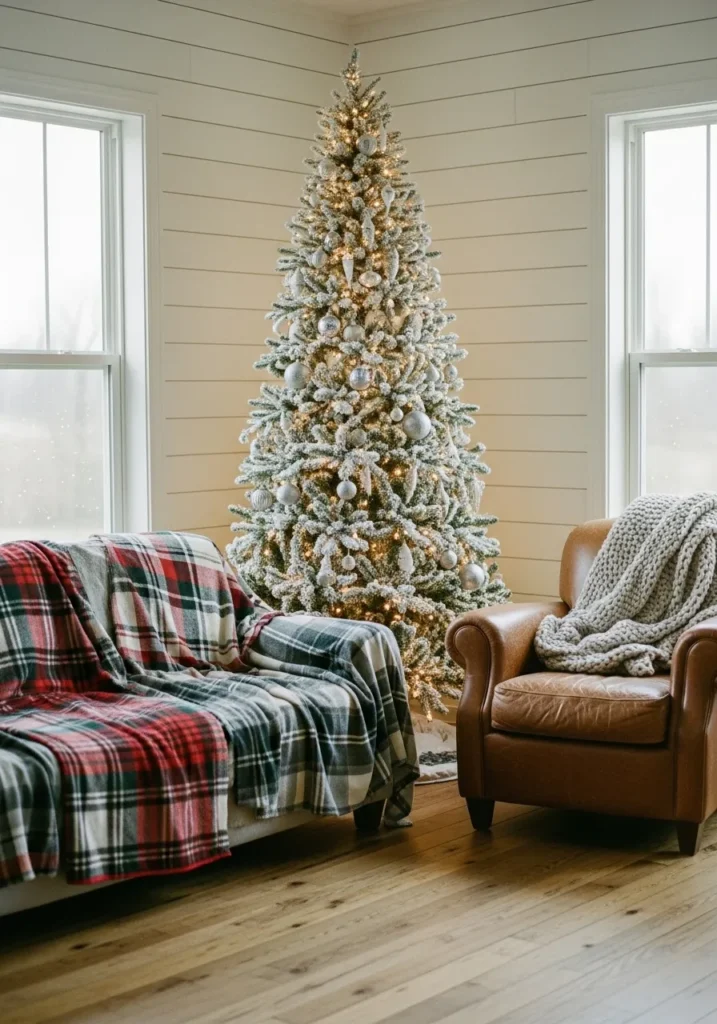 This beautiful living room captures that timeless farmhouse coziness we all crave at Christmas. The softly flocked tree stands tall between two bright windows, its snow-kissed branches dotted with silver ornaments that shimmer gently under warm fairy lights. A simple plaid blanket draped over the sofa adds just the right pop of color, while the caramel leather armchair paired with a chunky knit throw brings in that perfect mix of comfort and texture. The shiplap walls and natural wood floors give the whole space an easy, lived-in warmth that feels both classic and relaxed.