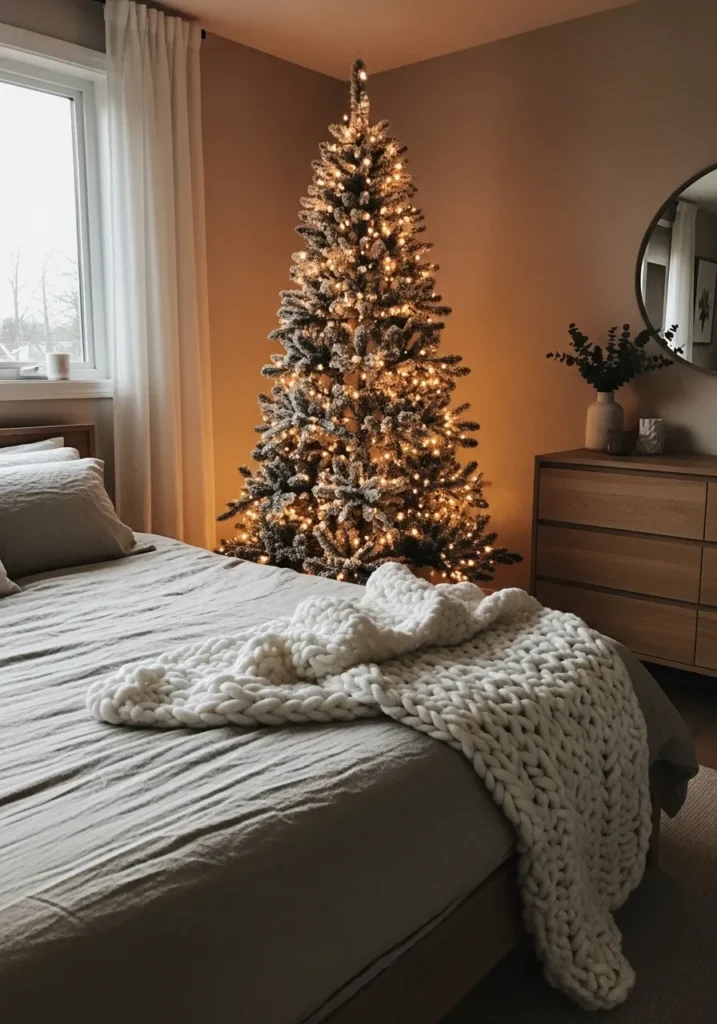 This design feels like a gentle winter morning wrapped in softness. A beautifully flocked Christmas tree glows in the corner of a calm, neutral bedroom, its golden lights reflecting against warm beige walls and natural wood furniture. The thick knit blanket draped across the bed adds a cozy layer of texture, while soft linen bedding and sheer curtains keep the space light and airy. The overall look is minimal yet comforting, perfect for anyone who loves understated holiday charm.