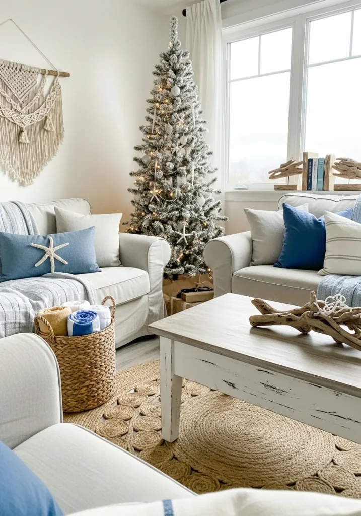 This coastal-inspired living room feels like a seaside holiday retreat wrapped in soft winter light. The flocked Christmas tree sparkles beside sunlit windows, its snowy branches dotted with starfish ornaments and delicate white baubles that tie beautifully with the ocean-toned pillows. Natural textures like the woven jute rug and wicker basket add warmth against the crisp whites and soft grays, while touches of driftwood and macramé art bring that laid-back beach charm to life.