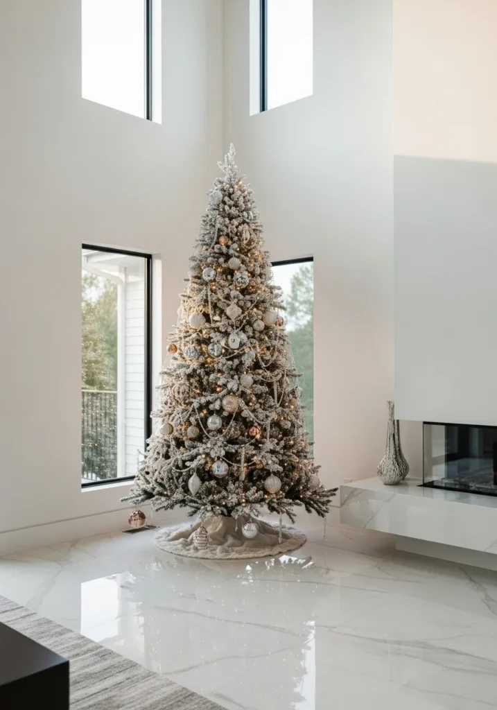 This stunning living room takes the less-is-more approach to a whole new level of festive perfection. With its double-height ceiling and sleek white walls, the space feels bright, open, and effortlessly sophisticated. The snow-flocked Christmas tree, dressed in shimmering gold and silver ornaments, stands tall like a winter sculpture, its glow reflected beautifully on the glossy marble floors. A low-profile fireplace and modern décor pieces complete the look, keeping everything clean, calm, and perfectly balanced.