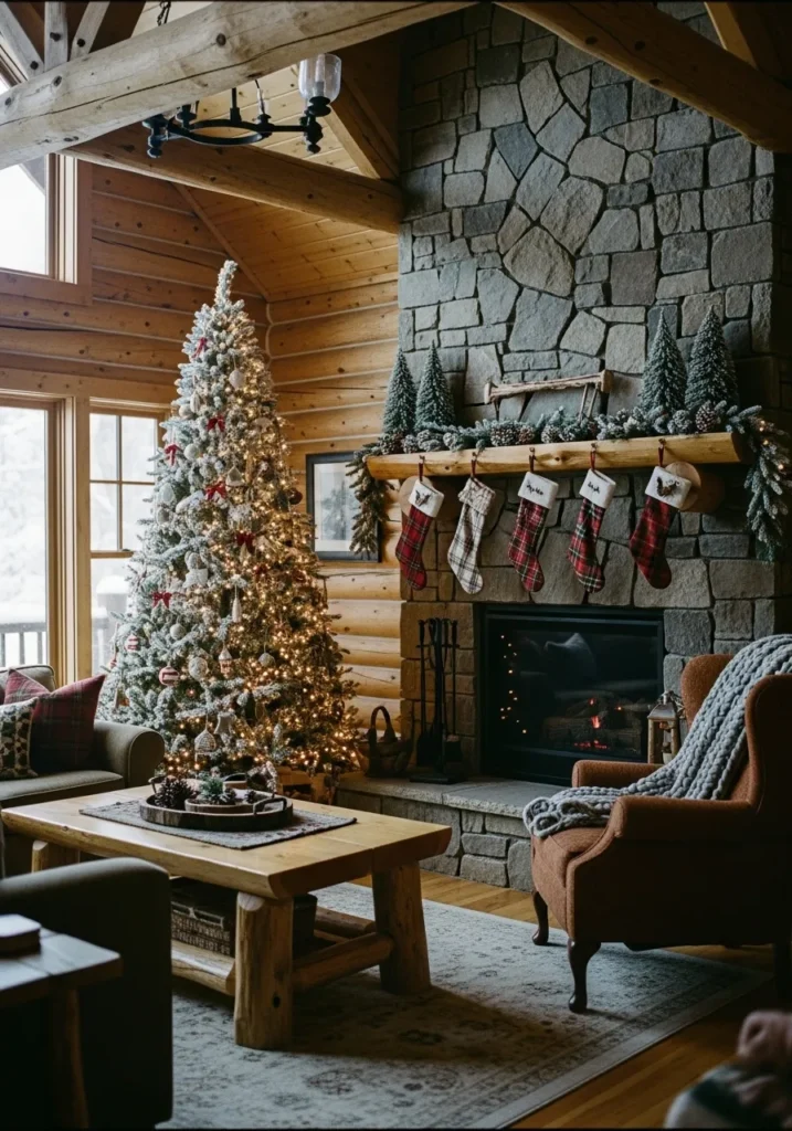 I absolutely love how this room balances rustic charm with magical Christmas elegance. The flocked tree brings such a dreamy, snow-kissed glow to all that wood and stone. It’s the kind of space that makes me want to curl up by the fire in my favorite fuzzy socks and just watch the lights twinkle all night. There’s something so comforting and timeless about a Christmas cabin that feels both real and enchanted at the same time.